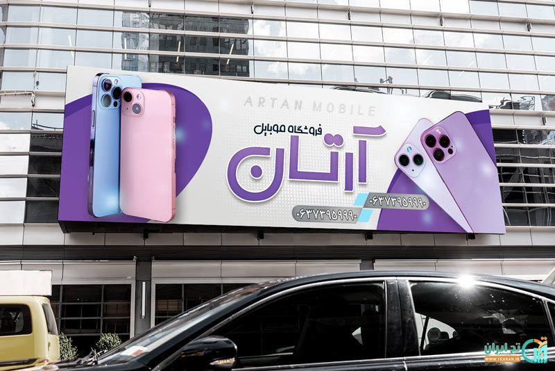 همچنین نام و برند موبایل فروشی شما به صورت برجسته وسط بنر نوشته می شود دو بخش طوسی رنگ مجزا برای شماره تلفن همراه و مغازه موبایل فروشی شما عزیزان، طراحی شده است.