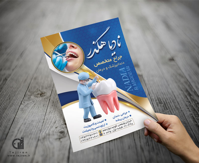 تراکت دندانپزشکی لایه باز با طراحی جالب، مناسب معرفی خدمات کلینیک های دندانپزشکی و دندانپزشکان متخصص می باشد.
