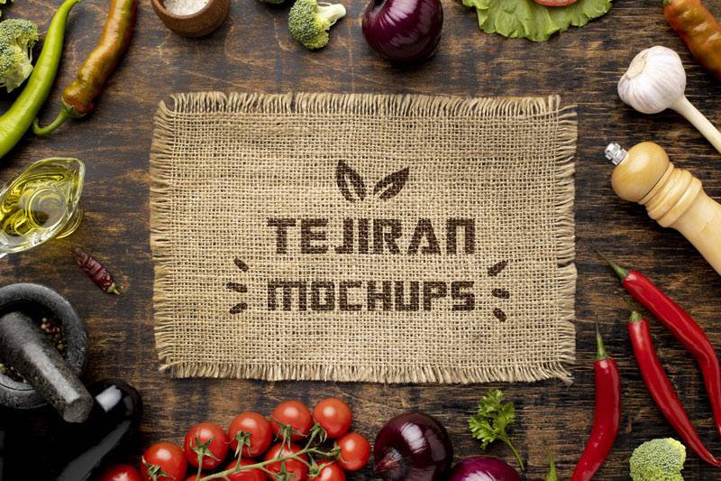 در این موکاپ، پارچه ای بافت دار بر روی میز چوبی به زیبایی چیده شده و اطراف آن با انواع سبزیجات و ادویه، فضایی گرم و طبیعی خلق شده که حس تازگی و سلامت را به بیننده منتقل می کند.