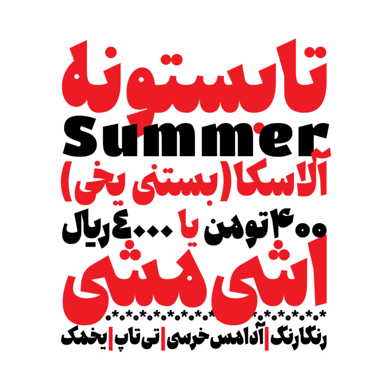 فرم حروف آن تلفیقی از تیزی و منحنی است، که حال و هوای تایپ های دهه ۵۰ را تداعی می کند این فونت مناسب برای عنوان ها و جملات کوتاه است و به عنوان یک محصول نمایشی طراحی شده است.