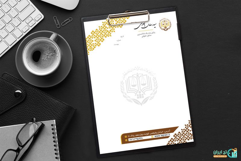سربرگ سنتی وکیل دادگستری لایه باز با رنگ بندی طلایی و قهوه ای که قابلیت بزرگ کردن در ابعاد بنر لارج فرمت و سایر ابعاد چاپی را دارد