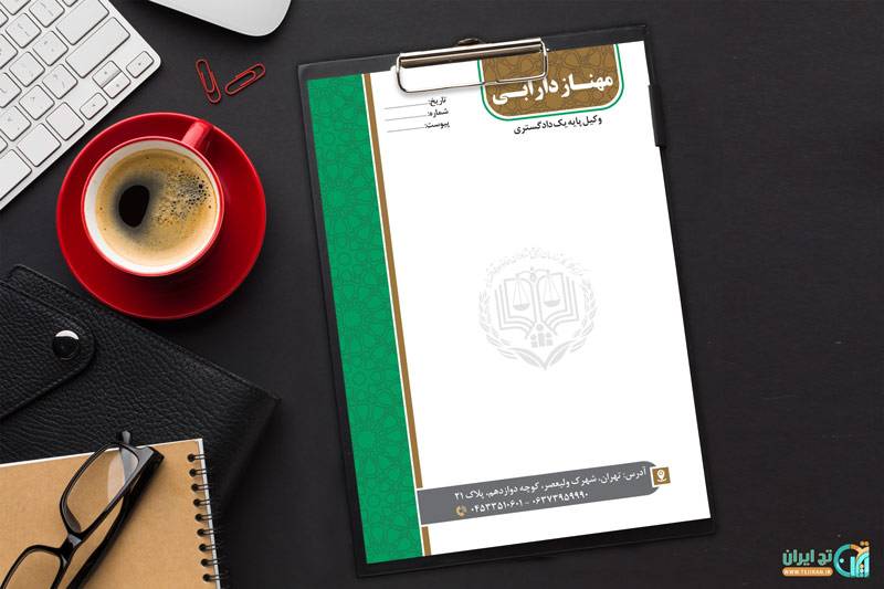 - نام وکیل/دفتر حقوقی: در بالای سربرگ، به همراه عنوان “وکیل پایه یک دادگستری” به صورت خوانا و حرفه ای درج شده است.