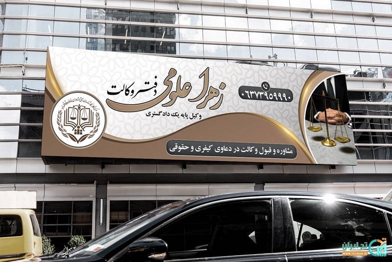 - نام وکیل، عنوان دفتر وکالت و شماره تماس به صورت خوانا و برجسته درج شده تا به راحتی در معرض دید قرار گیرد.