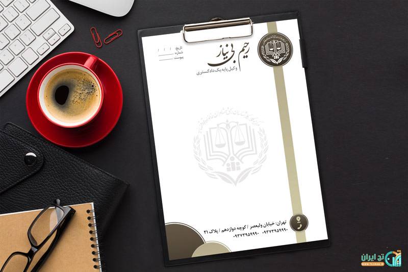 طراحی سربرگ وکیل لایه‌ باز باید ساده، منظم، و حرفه‌ ای باشد تا اعتبار و جدیت حرفه وکالت را منعکس کند.