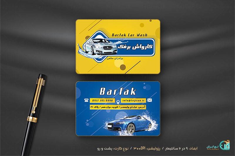 فایل لایه باز کارت ویزیت کارواش در دو رنگ آبی و زرد که برای کارواش می باشد این طرح زیبا را از سایت تجیران با هزینه اندکی دانلود کرده و مشخصات آن را تغییر دهید و چاپ و استفاده کنید.