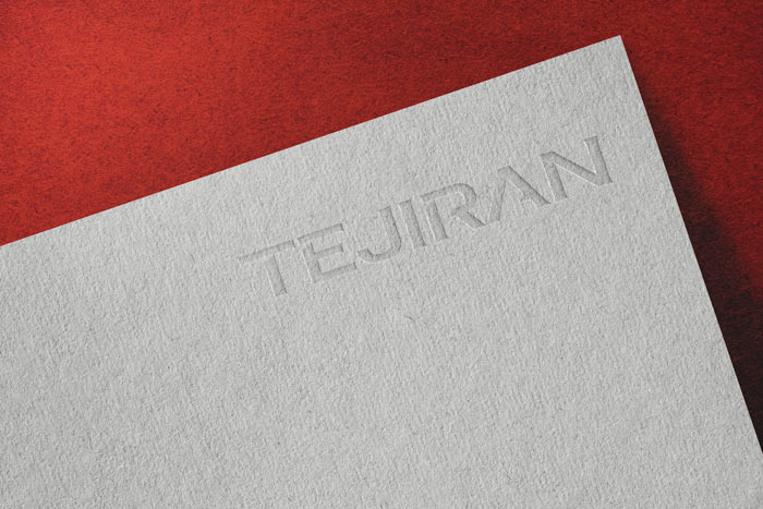 موکاپ لوگو برجسته کاغذی که در این تصویر، لوگوی برند «تجیران» بهصورت برجسته بر روی یک کاغذ بافت دار و با کیفیت بالا طراحی شده است.