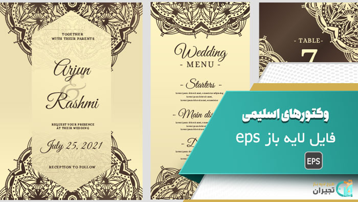 وکتورهای اسلیمی شامل چندین طرح وکتور اسلیمی زیبا و حرفه ای با فرمت لایه باز EPS است که به طور خاص برای استفاده در طراحی کارت دعوت، منوی مراسم، شماره میز و سایر عناصر گرافیکی مراسم ها (مانند عروسی یا مجالس رسمی) طراحی شده اند.