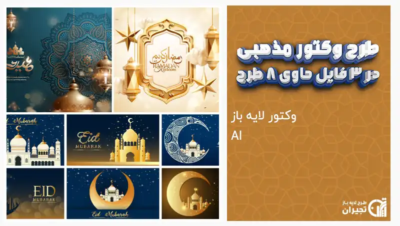 وکتور طرح مذهبی لایه باز شامل 3 فایل در 8 طرح با کیفیت عالی و رنگبندی های آبی، طلایی، سفید و قهوه ای برای شما طراحی شده است تا بتوانید به راحتی دانلود و ویرایش کنید.