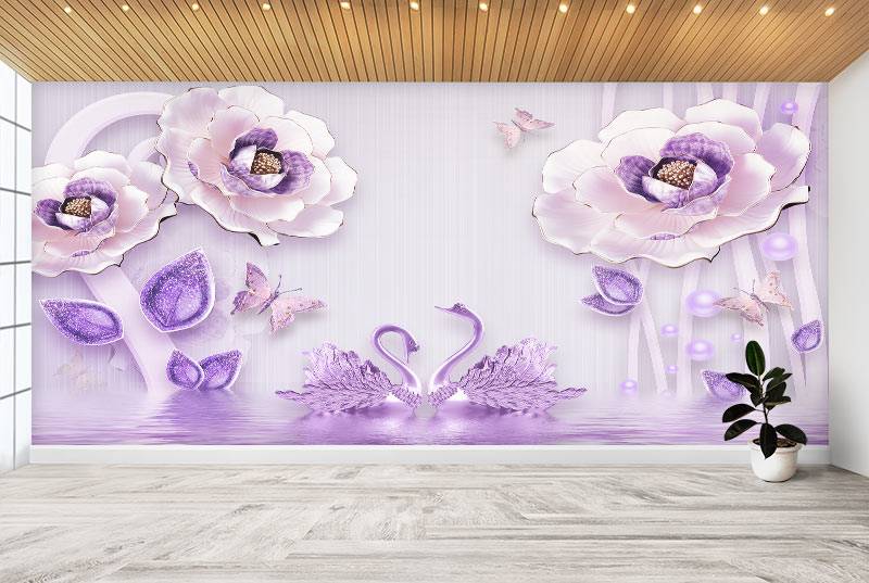 طرح کاغذ دیواری با گلهای صورتی و بنفش، طرحی زیبا برای ایجاد فضایی رمانتیک و زنانه در دکوراسیون داخلی است.