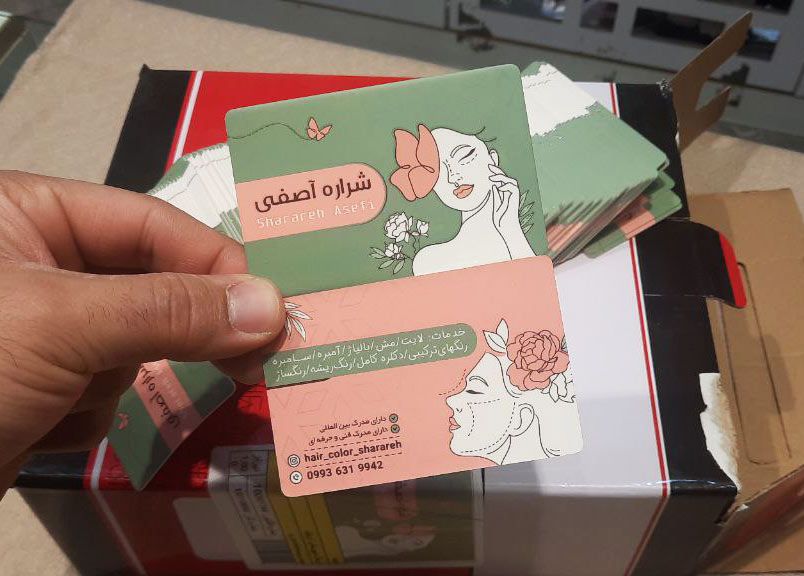 این کارت ویزیت مناسب برای سالن و آرایشگاه های زنانه می باشد و آرایشگرها برای تبلیغ و معرفی خود و دادن شماره همراه و آدرس به مشتریان و…. از آن استفاده میکنند.