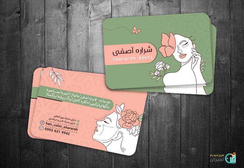 این کارت ویزیت مناسب برای سالن و آرایشگاه های زنانه می باشد و آرایشگرها برای تبلیغ و معرفی خود و دادن شماره همراه و آدرس به مشتریان و…. از آن استفاده میکنند.