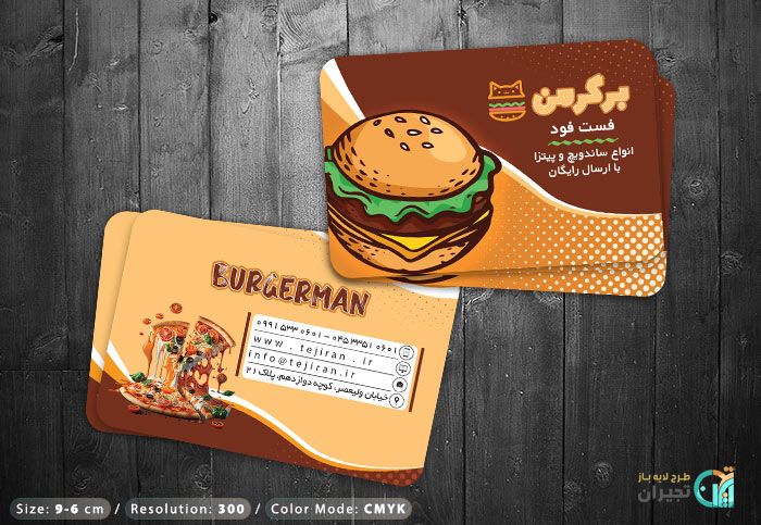 کارت ویزیت آماده فست فود با رنگبندی قهوه ای و طلایی که از تصویر با کیفیت و جذاب از ساندویچهای خاص و پیتزا استفاده شده است.