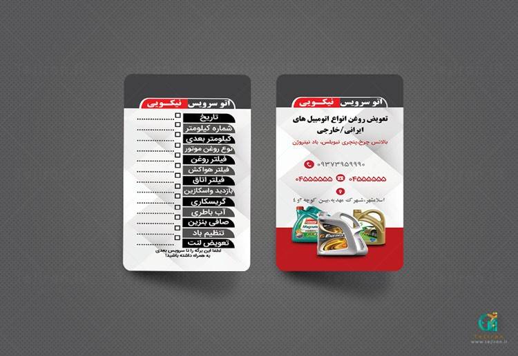 کارت ویزیت لایه باز برای سرویس کاری و تعویض روغنی یک ابزار مهم در تبلیغات و معرفی خدمات این کسب و کار است.