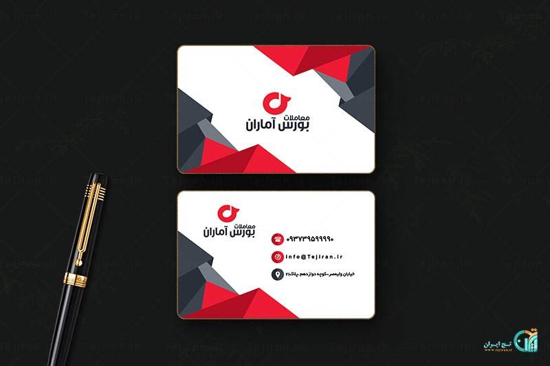 دانلود نمونه طرح لایه باز و قابل ویرایش کارت ویزیت خدمات بورس در طرح poly که میتوانید در سایر مشاغل نیز از این کارت ویزیت براحتی استفاده کنید این کارت ویزیت در رنگبندی سرمه ای و قرمز و سفید طراحی شده است.