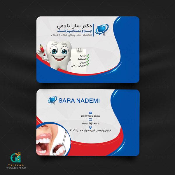 فایل لایه باز کارت ویزیت دندانپزشکی که در رنگبندی آبی و قرمز طراحی شده و میتوانید از این کارت ویزیت بصورت قابل ویرایش استفاده کنید.