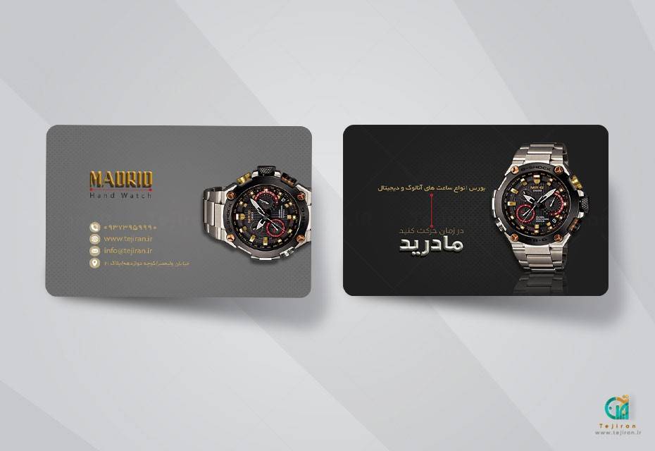 کارت ویزیت فروشگاه ساعت و اکسسوری بصورت پشت و رو،با کیفیت عالی در سایز استاندارد و مناسب برای چاپ کارت ویزیت لمینت، در نرم افزار فتوشاپ (cs6) طراحی شده است.