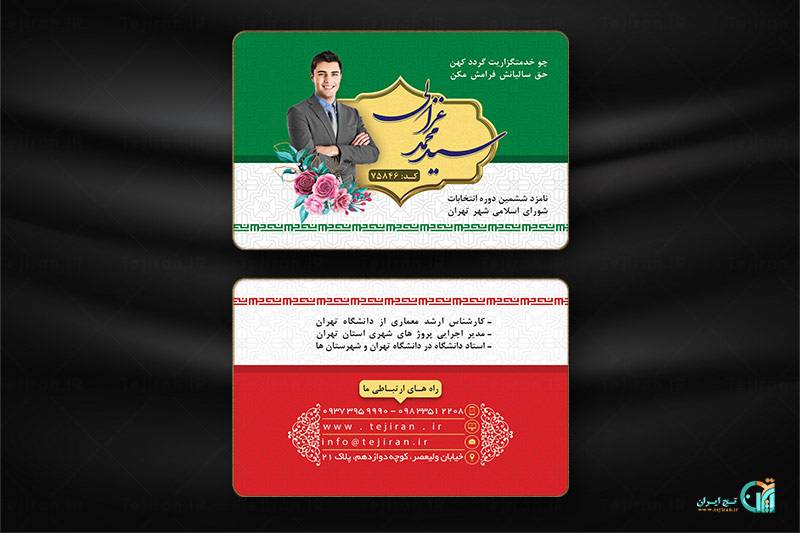 دانلود طرح کارت ویزیت لایه باز انتخابات که بصورت زیبایی طراحی و آماده دانلود و ویرایش می باشد این طرح  طوری طراحی شده است که اگر روی هم قرار گیرند پرچم ایران با سه رنگ درست میشود