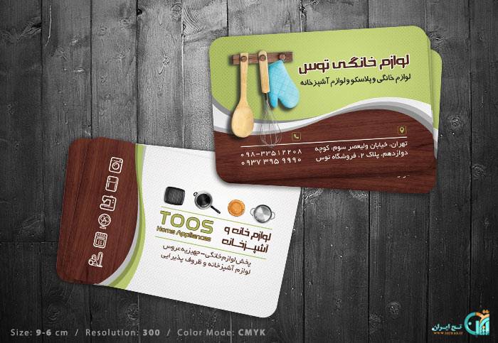 این کارت ویزیت در رنگبندی سبز و قهوه ای می باشد و در این کارت از تصاویر لوازم آشپزخانه و ظروف استفاده شده و برای مغازه های پلاسکو، لوازم‌خانگی و فروشندگان آن مناسب است.